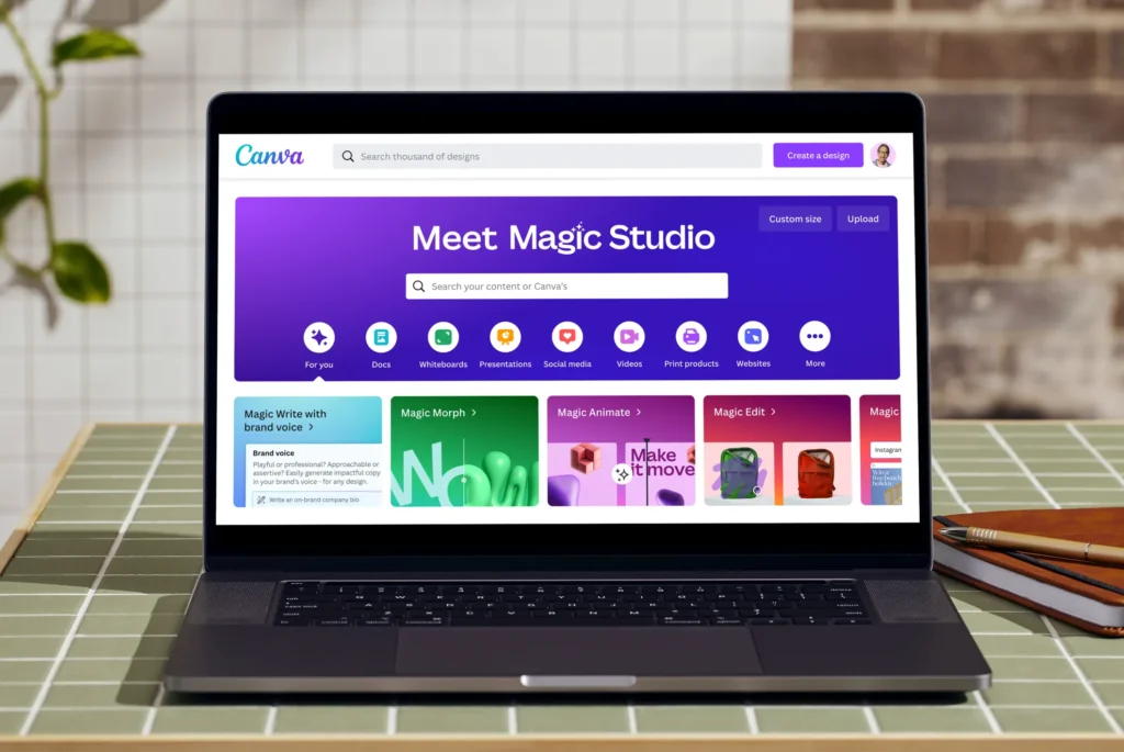 Canva’s business value concentrates in workflow consolidation. Instead of juggling Photoshop for image editing, PowerPoint for presentations, and Mailchimp for email graphics, one platform handles most routine visual production. A retail business owner can create promotional flyers, update their website hero image, design email campaigns, and produce Instagram stories without context-switching between applications.
