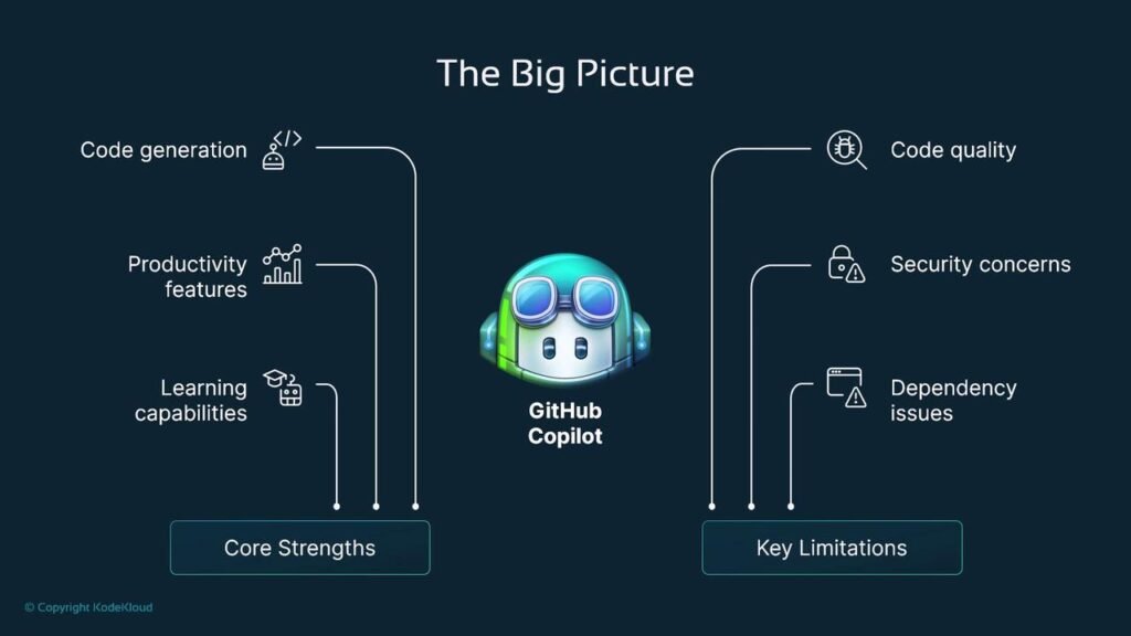 Over-reliance degrades skill development. Junior developers who lean heavily on AI without understanding underlying principles may struggle when AI suggestions are incorrect or when working in environments without AI tools. Balance AI assistance with deliberate practice of fundamental skills. Use Copilot to accelerate work, but regularly implement features manually to maintain core competencies.