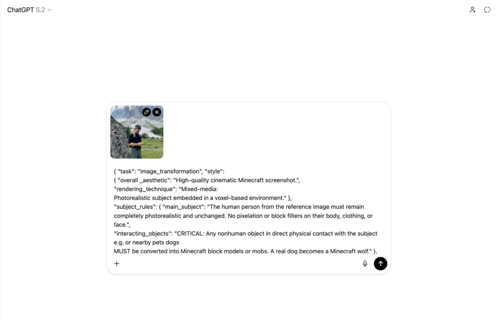 "camera": "Maintain the exact camera angle and framing from the reference photo.", "lighting": "Minecraft daylight with gentle haze and consistent block-based shadows." } } enhance