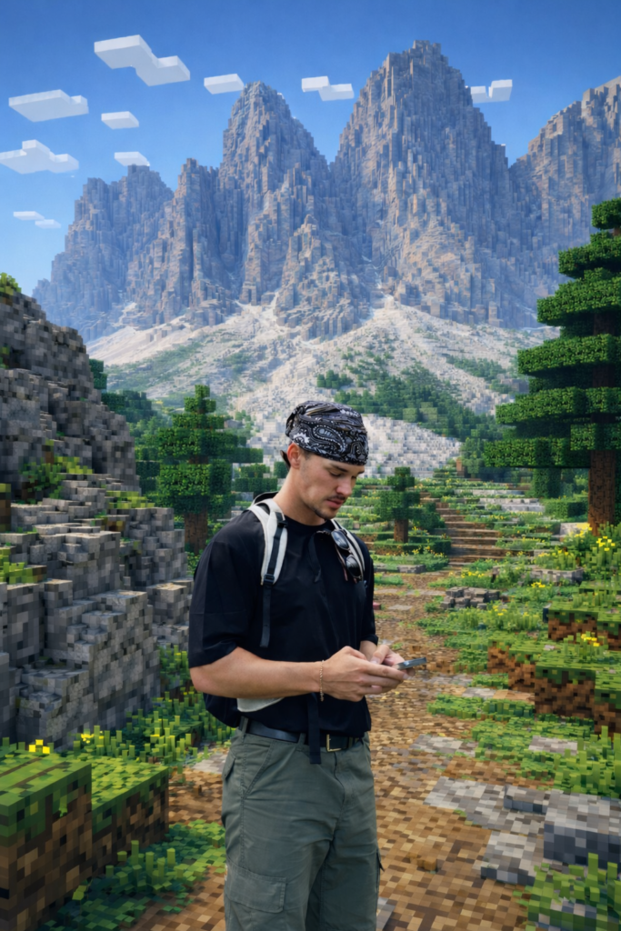 A fully realistic person standing inside a cinematic Minecraft world.