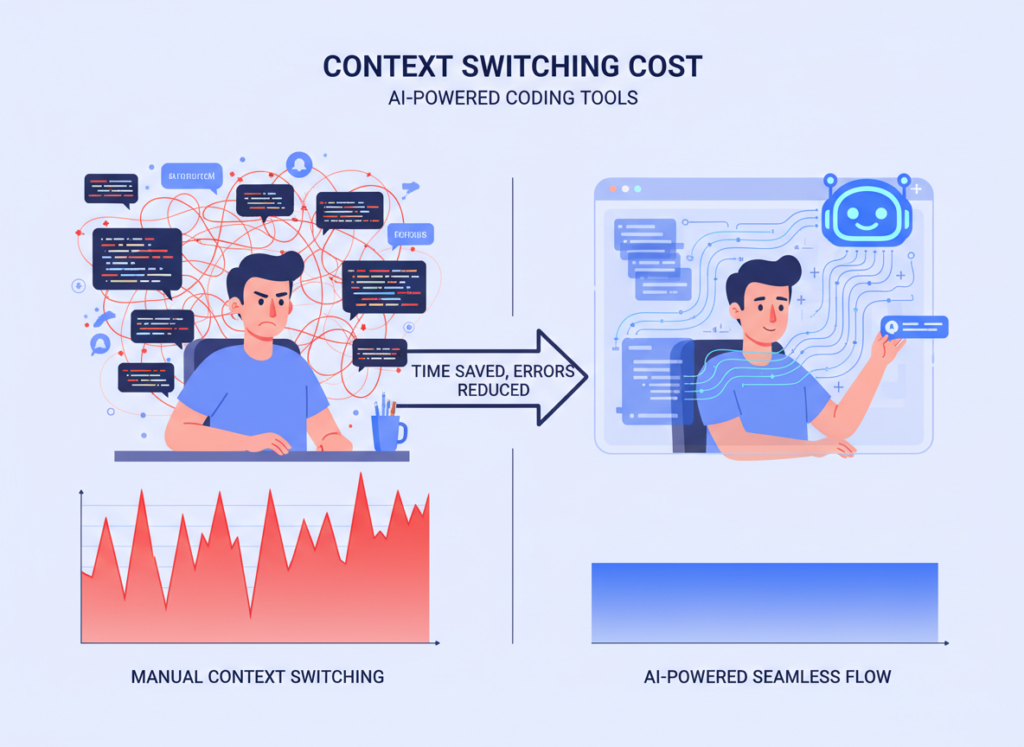 The cognitive tax isn’t just lost minutes. It’s lost flow states. Deep work, the kind where you architect a clean solution or untangle a gnarly bug, requires sustained concentration. Every time you context-switch to look up syntax, write a README section, or draft a Slack update for a client, you’re paying the 23-minute re-entry fee.
