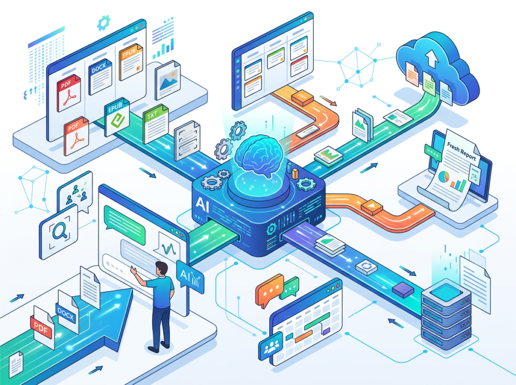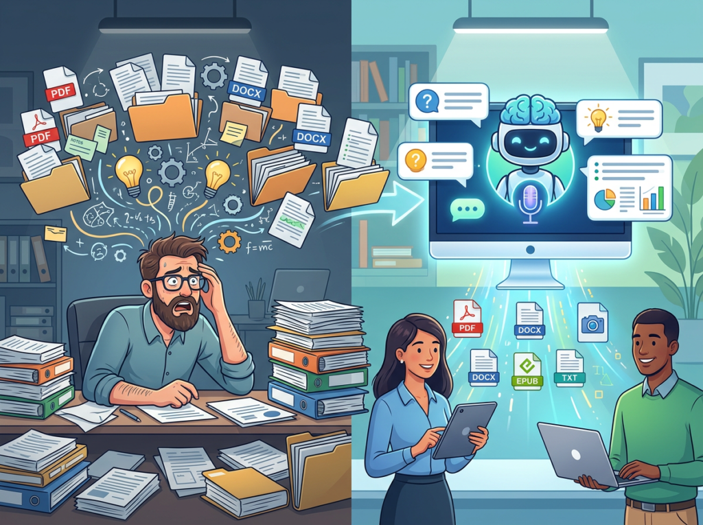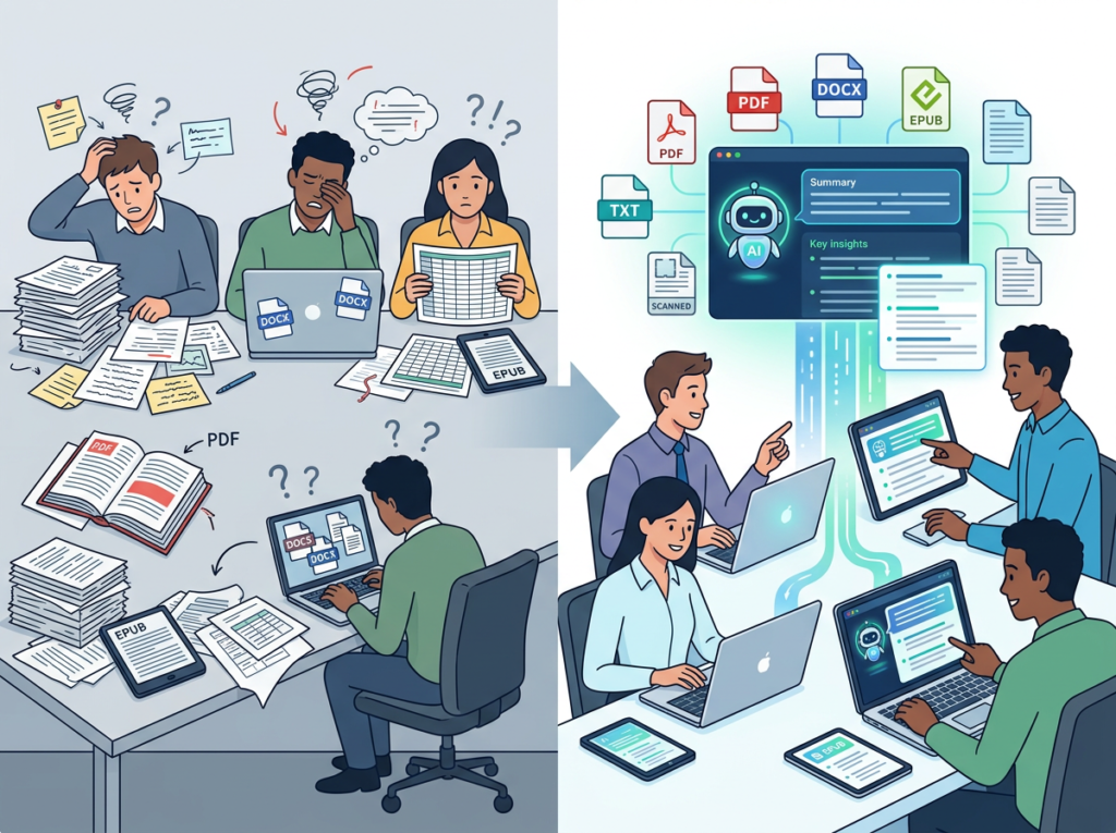 The AI solution: a chat with pdf ai tool that transforms static document libraries into interactive knowledge bases. Instead of re-reading a 60-page market research report, a team member queries it directly and gets a structured answer in under 30 seconds.