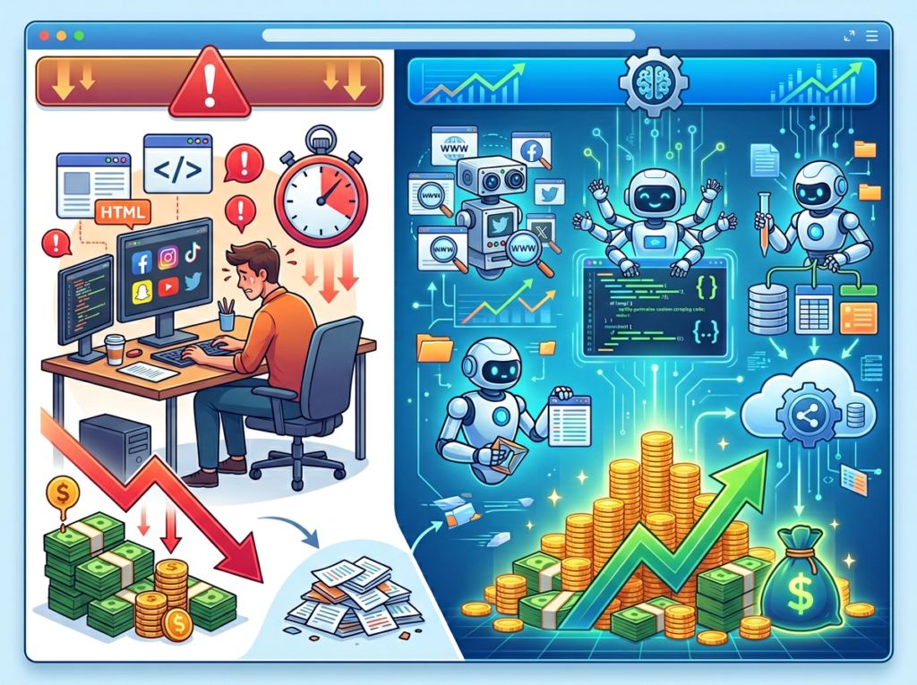 Traditional web scraping requires a developer to write custom code for each target site. At US developer rates of $100–$150 per hour, building even a modest multi-site scraping infrastructure costs $2,000–$4,000 in upfront engineering time — before the maintenance clock starts ticking.
