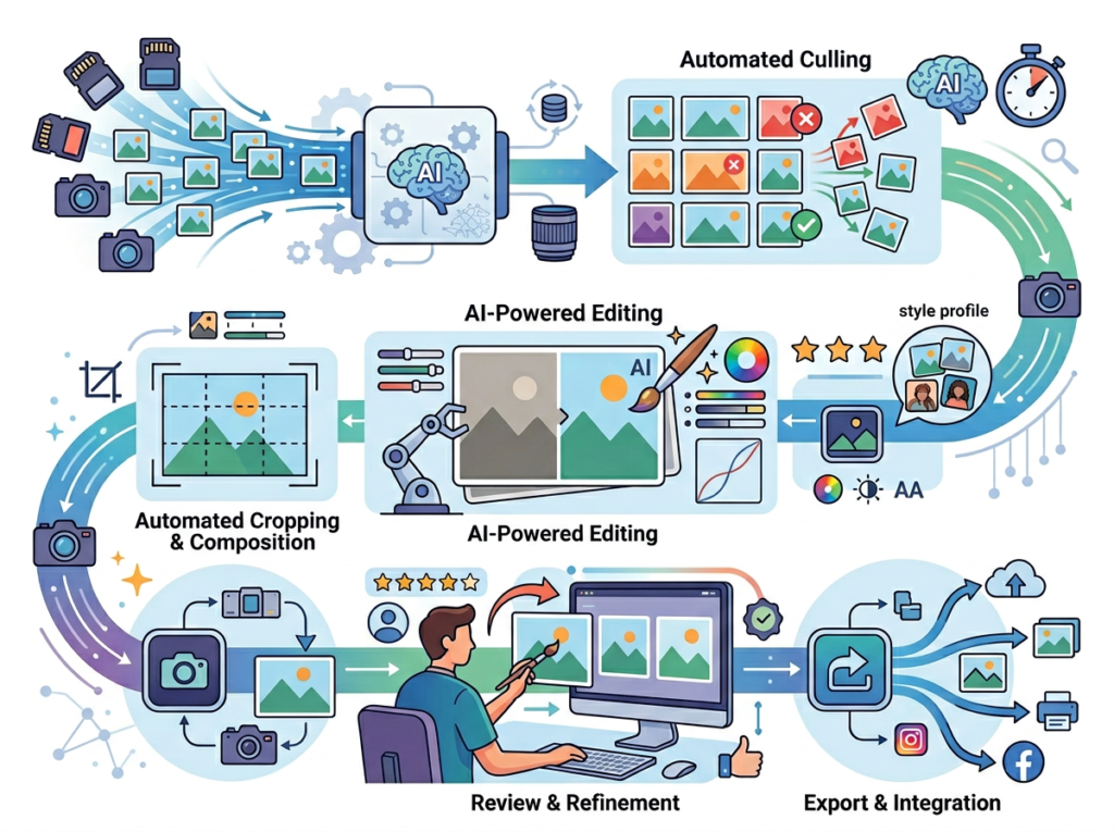 Elena, a boutique portrait studio owner in Atlanta, restructured her entire post-production workflow around this orchestration model. Her previous process: import, manually cull, manually edit batch by batch, export, deliver. Her new process: import, run AI first-pass (culling + profile edit), review AI output for 45 minutes, creative overrides on 8–10 hero images, export. Her monthly editing overhead dropped from 38 hours to 14 hours — 24 hours recovered every month to reinvest in studio marketing and client experience.