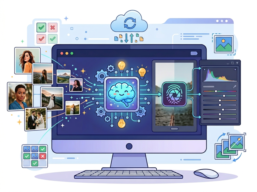 AI photo editing for small business refers to using machine learning software to automate the technically repetitive parts of photo post-production — tasks like exposure adjustment, white balance correction, culling, and tonal consistency — so that photographers and small studios can process more images in less time without sacrificing their personal editing style. Unlike generic presets, modern AI editing tools learn your specific editing approach and apply it dynamically across new sessions.