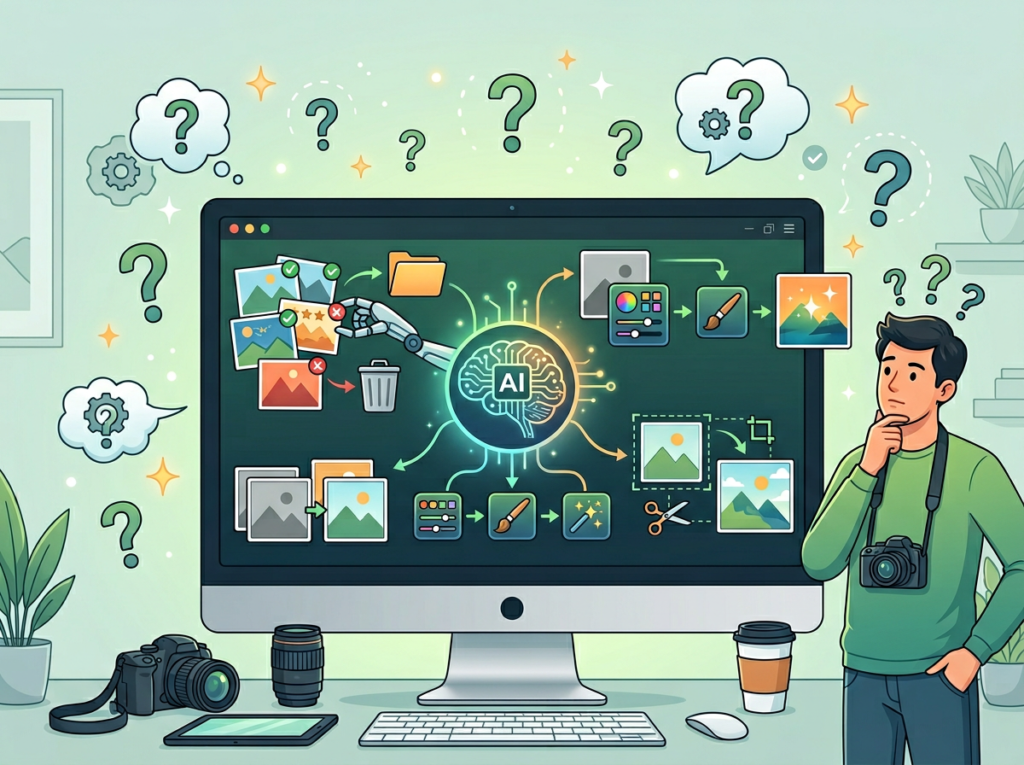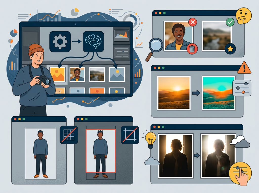 The most powerful framing for AI photo editing isn’t “automation” — it’s orchestration. Think of AI as your editing first-pass assistant who handles all the technically sound but creatively straightforward adjustments: exposure normalization, white balance consistency, basic tonal correction, duplicate grouping, blink detection.