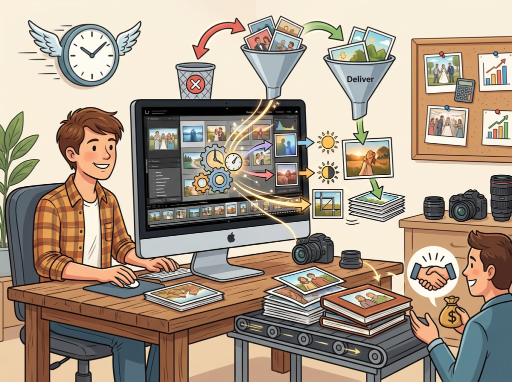 You booked the clients. You shot the sessions. The images are beautiful. But now you’re at your desk at 11 PM, three galleries deep in a Lightroom backlog, manually adjusting white balance on photo 847 of 2,300 from last Saturday’s wedding. Your inbox has four new inquiries you haven’t had time to answer. Your delivery deadline for the Johnson family portraits was yesterday.