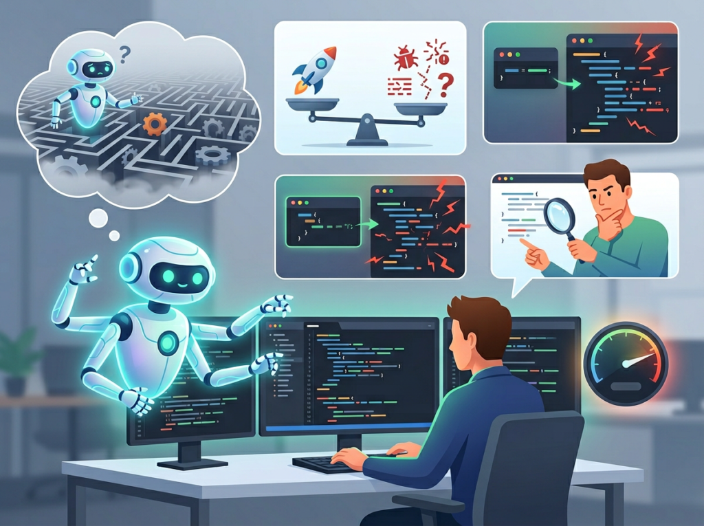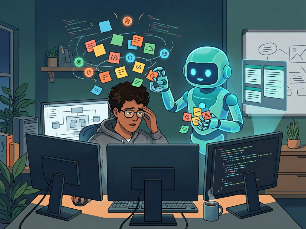 Cognitive offloading means delegating mental work — memory, calculation, decision routing — to an external system so your working memory stays available for higher-order thinking. When a solo founder uses a no-code workflow automation tool, they offload execution but still carry the design and maintenance burden. An AI coding agent goes further: it offloads design, execution, debugging, and future adaptation, because it can read existing code, understand intent, and extend the system when requirements change.