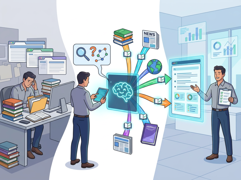 Inbox at 200 unread. Calendar packed. A client asking for a competitive analysis by Friday. You open a browser tab, type a question, and spend the next forty-five minutes chasing links that are outdated, paywalled, or vaguely related to what you actually need. You triangulate between three sources, worry one of them is biased, and draft a summary you’re still not fully confident in. By the time you’re done, half the morning is gone.