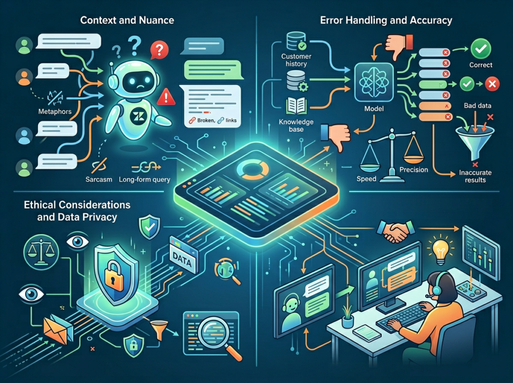 Hallucination in AI-drafted replies is rare but not zero. If your generative AI drafts a reply that contains an incorrect policy detail and your agent sends it without reading, you have a customer service and potentially a legal problem. Establish a policy that agents must read AI-drafted replies fully before sending — not skim them.