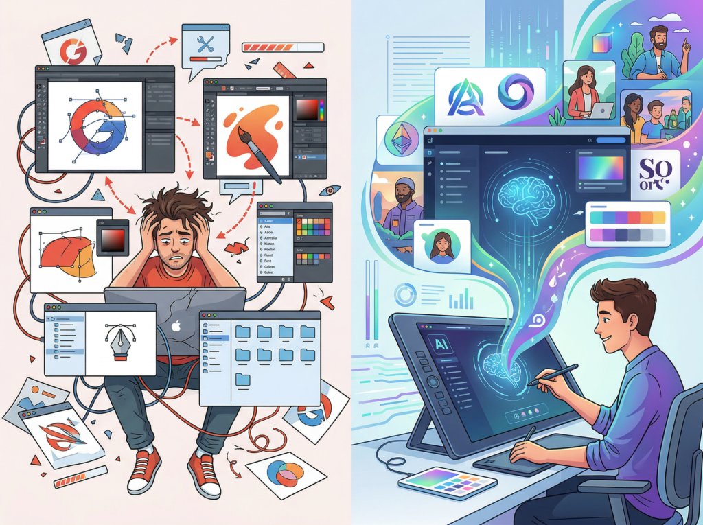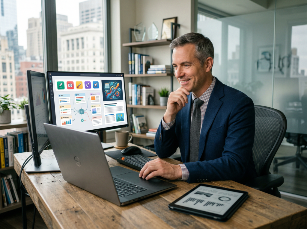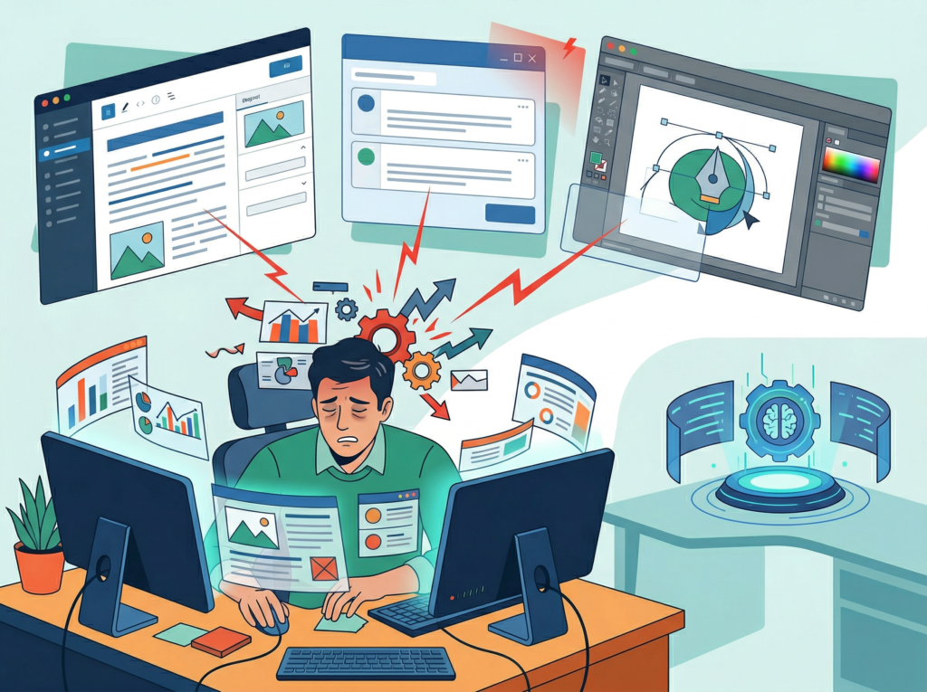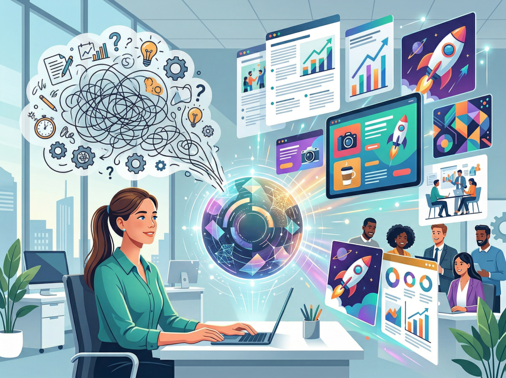 Here’s what most efficiency guides miss: the problem isn’t how much you’re doing. It’s the invisible cognitive weight of all the small decisions surrounding every task — what should my brand look like, how do I present this to a new client, what goes on this week’s social post. Each micro-decision drains the same mental energy as a major strategic call, and for solo operators, they compound into hours of daily drag.